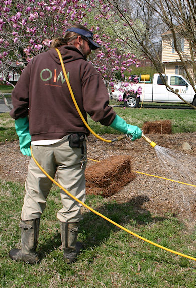 A slow deep watering is essential, rather than several quick applications. Water once a week, (normally 30 minutes to one hour per tree), in hot weather, unless there is at least one inch of rainfall each week to 10 days. You may want to check the soil moisture about one foot down (at outside of the hole to avoid root damage) to make sure you are watering enough, but not too much. Deep infrequent watering on turf and plants.