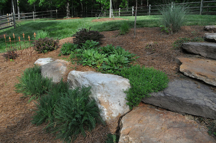 - Decorative pea gravel for walk and driveways with accents of Alabama Brown in ½ and oversize.
